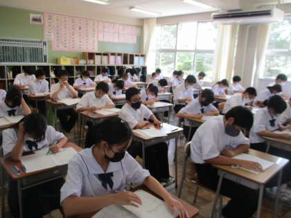 6/28(月)今日は、1年生にとって中学校生活初の定期テスト「1学期末考査」がありました。今日行ったのは「英語」「音楽」「理科」の3教科です。いつもとは違う雰囲気に少し緊張した様子が見られました。テスト後、ほっとした表情で友達と答え合わせをしていました。明日・明後日もこの調子でがんばって!