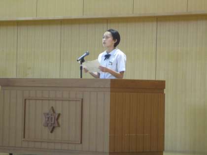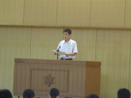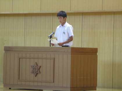 終業式の前に意見発表会を行いました。各学年の代表生徒が1学期に頑張った部活動やクラブチームでの活動やクラスでの取組などについて発表しました。また、2学期に向けての意気込みも発表し、全校生徒からは大きな拍手が沸き起こりました。
