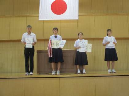 受賞報告会 公開日 2021/07/21 更新日 2021/07/21 最近の水中の様子 終業式の前に受賞報告会を行いました。陸上競技部とバトミントン部、柔道部の生徒が北信越大会に出場します。また、クラブチームでの活動で北信越大会に出場する生徒もいます。大会に万全の状態で挑めるように日々の練習に取り組んでほしいですね。ガンバレ水中生!!
