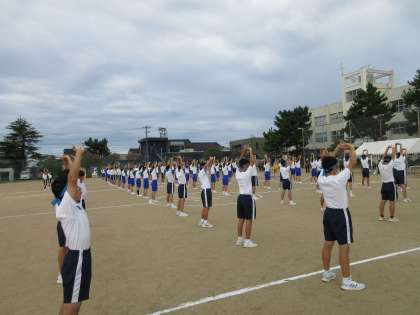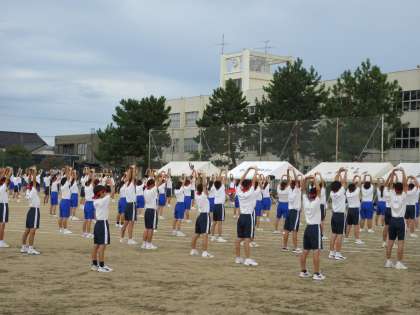 競技にさきがけて準備運動です。体をほぐして競技に臨みます!