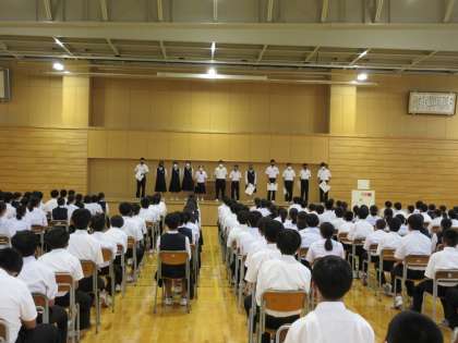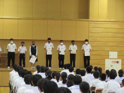 受賞報告会 公開日 2021/10/01 更新日 2021/10/01 最近の水中の様子 生徒会役員任命式に続いて受賞報告会を行いました。今回は陸上競技部とバトミントン部、柔道部の生徒の表彰を行いました。 また、いよいよ延期となった新人大会が始まります。水中生の活躍に期待しましょう。