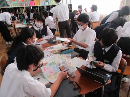 11月11日〈木〉に、2学年は校外学習を実施する予定です。金沢で体験学習をしたいと考えています。生徒たちは、パンフレットやPCから情報を得て、それぞれの班別コースを話し合っています。今から金沢に行くのが楽しみでしょうがないという雰囲気で、どの班も楽しくコース作りをしていました。