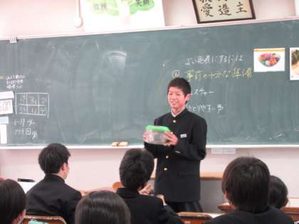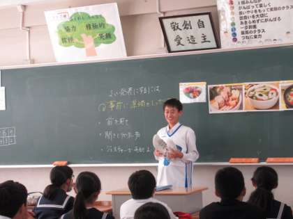 英語で自己紹介 公開日 2021/10/22 更新日 2021/10/22 第1学年 10/21(木)英語の授業の様子です。ALTのルエラ先生に、英語で自己紹介をしました。生徒は自分の好きなものや得意なものを持ち寄り、紹介していました。発表する生徒は堂々と、聞く生徒は楽しそうな様子で参加していました。