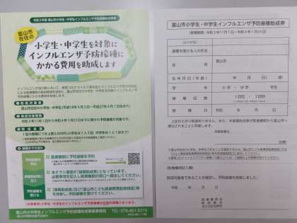 インフルエンザ予防接種にかかる費用助成について 公開日 2021/10/26 更新日 2021/10/26 最近の水中の様子 本日富山市在住の小中学生を対象としたインフルエンザ予防接種にかかる費用の助成に関するプリントを配布しました。プリントの裏面はインフルエンザ予防接種助成券となっているのでご利用の際はそのままお使い下さい。富山市のホームページからもダウンロードできます。
