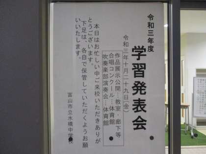 いよいよ明日本番! 公開日 2021/10/28 更新日 2021/10/28 最近の水中の様子 明日は学習発表会です。一通り会場準備が終わりましたが、生徒のいない放課後の校舎には美しいハーモニーの余韻がまだ残っています。本番でクラスの練習の成果が発揮されることを願います。 各教科による掲示物や学年フロアには行事写真も多数展示してあります。学校生活の様子が少しでも伝わればと思います。明日が楽しみです。