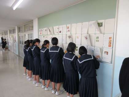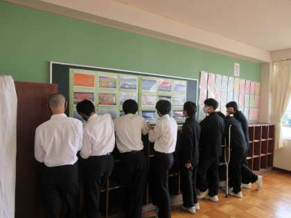 写真は各学年の作品を鑑賞している様子です。先輩・後輩の作品に興味津々でした。