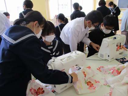 家庭科の授業では、ミシンを使ってクールパンツを作成しています。この日はポケットをつける作業をしました。慣れないミシンの操作に苦戦しながらも、班のメンバー同士で教え合って作業している様子が印象的でした。仕上がりが楽しみです。