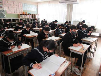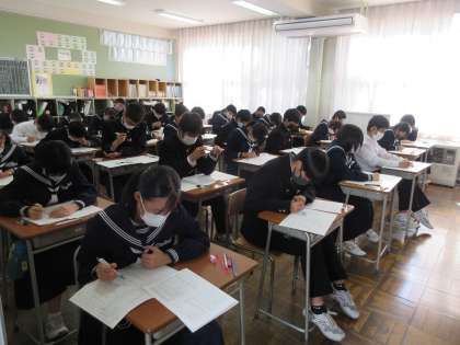 中教研学力調査1日目 公開日 2021/11/04 更新日 2021/11/04 第1学年 11/4(木)中教研学力調査1日目です。今日、1学年は英語・国語・理科を受けました。小学校から中学校前期で習った分が出題範囲という、大変広い範囲のテストでしたが、分かる問題から必死に解いていました。明日は社会・数学のテストです。今日の自宅学習もがんばって!