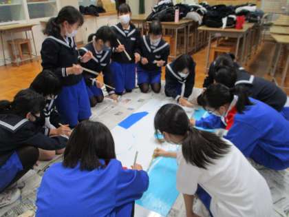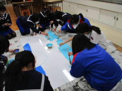 美術部の取組 公開日 2021/12/01 更新日 2021/12/01 最近の水中の様子 美術部では大作に取りかかっています。水橋駅前にある「世界一かわいい美術館」の看板制作を依頼され、試行錯誤しながら進めています。畳9枚分の超特大サイズのパネルに奮闘する毎日です。定期的に途中経過をお知らせしていきます。