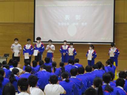 全校レクリエーション その4 公開日 2021/12/19 更新日 2021/12/19 生徒会 閉会式の様子です。 はじめはチーム内で恥ずかしさも見られましたが、競技を通して全校生徒の仲が深まったように感じられる時間でした。 今回のレクリエーションに向けて、生徒会執行部は連日、朝や放課後の時間に準備をしていました。楽しい時間をつくってくれた生徒会執行部のみなさん、ありがとうございました。