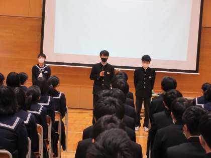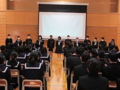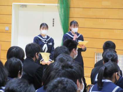 4時間目に学年集会をしました。各学級の班長が2学期の振り返り、学級MVPの表彰を行いました。また、3学年スタッフから冬休み中の生活・学習についての話をしました。