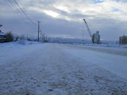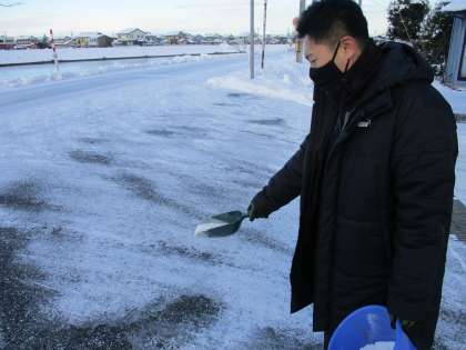 ※凍結防止剤(塩化カルシウム)を散布しています。水は0度で凍結しますが、凝固点を−50度まで下げるはたらき(凍っている雪や氷を溶かす)があります。大変便利ですが、皮膚に触れると炎症をおこす場合があります。雪には触らないように注意して下さい。触れた場合には水で洗い流して下さい。