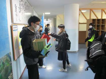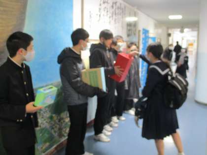 挨拶運動(2A前半)&ボランティア活動 公開日 2022/01/25 更新日 2022/01/25 生徒会 今週は2Aの皆さんが挨拶運動の担当です。 また、今日から4日間「インクカートリッジ回収」「書き損じはがき回収」「友情の絵はがき募金」も行っています。水中生の皆さんの温かい気持ちで、地域社会に貢献しましょう。ご協力よろしくお願いします。
