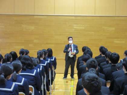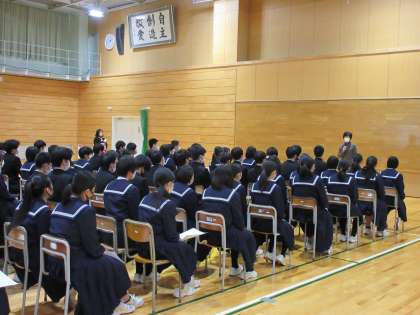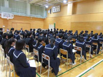 3年生は6時間目に学年集会を行いました。2/3(木)に行われる私立高校一般入試に向けて、校長先生と学年の先生からの話を聞き、その後各高校ごとに当日の打ち合わせをしました。