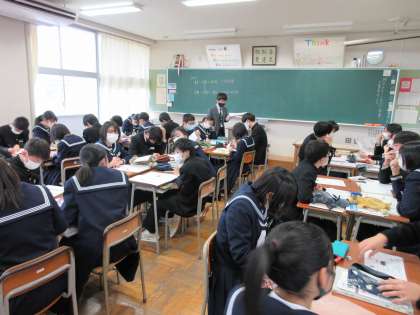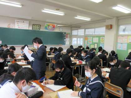 本日の授業 3A社会 3B数学 公開日 2022/02/15 更新日 2022/02/15 第3学年 1時間目の授業の様子です。3A、3Bどちらも実践形式のプリントに取り組んでいました。グループの人に分からないところを聞いている様子が見られました。残り少ない授業を大切にしてほしいですね。