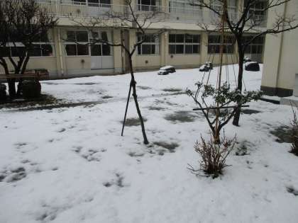 昨日は春一番の風(南よりの風)でしたが、今日と明日は強い寒気と冬型の気圧配置で大雪の予報です。朝からの雪で校舎周りも真っ白です。(画像:中)