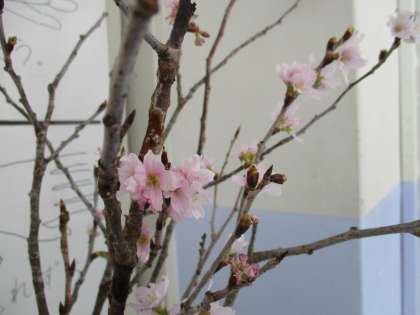 校舎内では啓翁桜(ケイオウザクラ)が咲いています(画像:下)。花弁の色は気温によって白色やピンク色になるそうです。桜咲く季節が待ち遠しいですね。