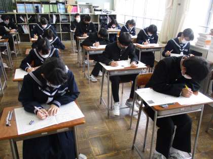 本日(2/17)は学年末考査の2日目です。理科と社会科の試験に臨みました。直前まで、教科書やワークブックを開いて、確認し合う姿が見られました。テスト後から春休みにかけては、テキストを使って2学年の総復習に取り組み、積み残しがないようにしましょう。