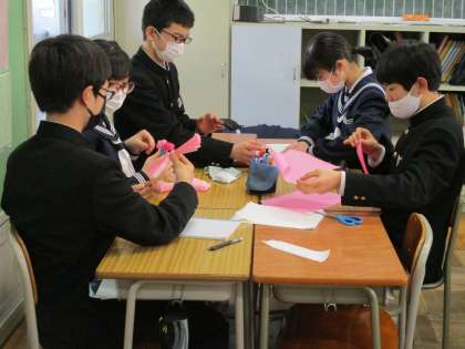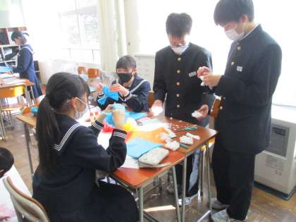 1学年では、3年生への感謝の気持ちと次年度入学する新1年生への歓迎の気持ちを込めて、祝画作成を始めました。生徒は心を込めて、よい祝画になるようアイディアを出し合い、各グループで楽しく制作していました。制作した祝画は教室や廊下に飾られます。