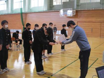 1学年 学年集会 公開日 2022/03/24 更新日 2022/03/24 第1学年 3/23(水)最後の学年集会を行いました。学年生徒会がこれまでの学習・生活・部活動・学校行事についてアンケートをとり、グラフにまとめて発表しました。また、今学期の生徒投票によるMVPを表彰しました。2学年になっても、様々な場面で個人のよさを発揮しよりよい学年になっていきましょう。