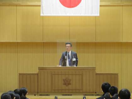 担任発表の後、生徒指導主事より新学期の生活についてお話がありました。昨年度、生徒会が中心となった思いやりの気持ちを育てる企画は、人との関わり方を学ぶ機会となり学校全体の雰囲気をよくすることにつながりました。今年度も自分のできることで毎日を安心した状態にしていきましょう!と、メッセージを伝えました。