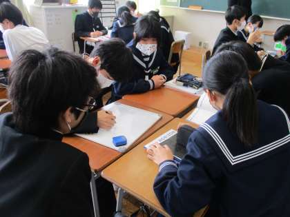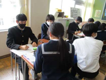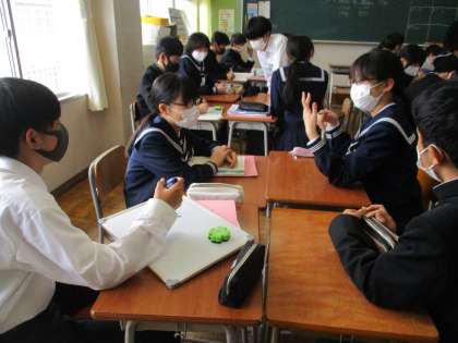 3年 今日の授業風景 公開日 2022/04/21 更新日 2022/04/21 第3学年 写真は、英語の授業の様子です。今日のテーマは受動態です。班対抗でALTの先生が出題するクイズに答え、点数を競い合いました。