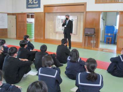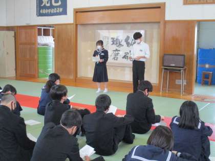 本日(4/22)の5時間目に、学年集会を開きました。前半は、今年度の学年目標・学級目標を発表しました。後半は、修学旅行の持ち物や活動中の決まりについての説明がありました。学年生徒会を中心に、話し合ってきたことを学年全体で共有しました。