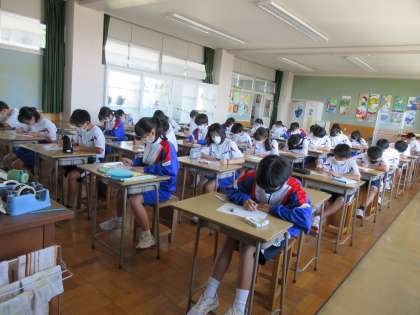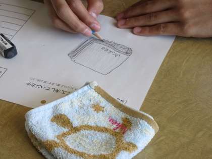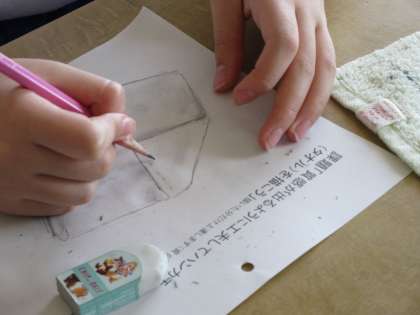 写真はハンカチを描いている様子です。鉛筆を立てたり寝かしたり、こすったり消したりして、自分の思った表現になるように工夫しています。