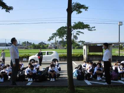 水橋ふるさと会館前で出発式を行い高岡へ向けて出発しました。