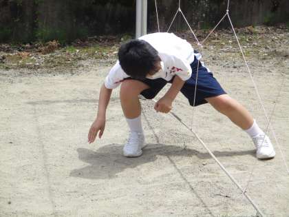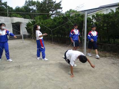 午前中は、イニシアティブゲームを行いました。班のメンバー全員がそれぞれの持ち味を出し合い、グループがひとつになって取り組むゲームです。皆、今回の目標である「絆〜協力、思いやり〜」を達成しようと懸命に頑張りました。くもの巣・・・くもの巣にさわらないように全員が通り抜ける。一度通った場所は、別の人が通ることはできません。
