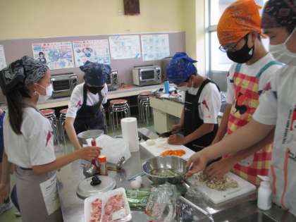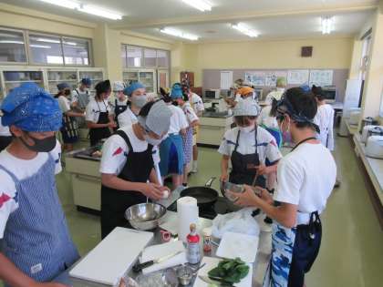 2年生は調理実習で豚汁をつくりました。班員と協力し、おいしい豚汁ができあがりました。