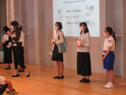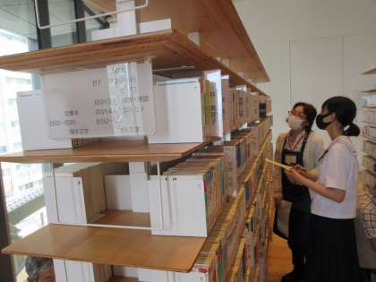 富山市ガラス美術館と市立図書館の活動です。ガラス美術館では、小学生を招待しての館内案内のお手伝いをしました。図書館は、予約されている本を司書の方に聞きながら探しました。