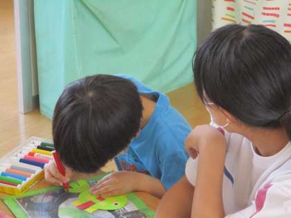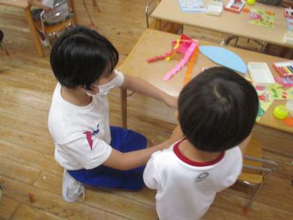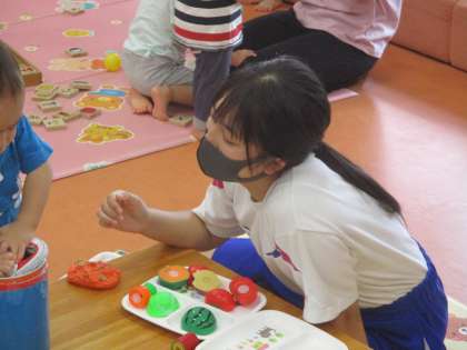 同朋認定こども園での活動の様子です。園児と工作やおままごとをしていました。姿勢を低くして子どもの目線で関わっている姿が印象的でした。