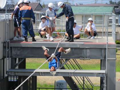 「14歳の挑戦」3日目(水橋消防署) 公開日 2022/07/06 更新日 2022/07/06 第2学年 今日は救助訓練を行いました。安全確認をしっかり行い、果敢に挑戦していました。普段私たちの暮らしを守る消防署の方々は、このような訓練をしていることを再確認し、訓練の厳しさを実感していた様子でした。
