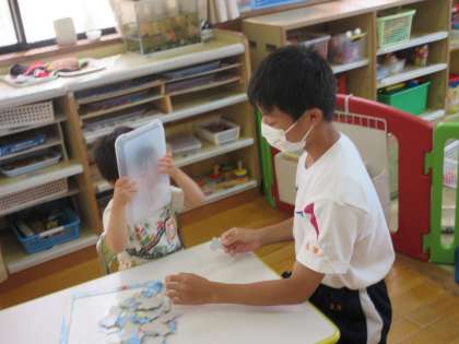 「14歳の挑戦」4日目(水橋東部保育所) 公開日 2022/07/07 更新日 2022/07/07 第2学年 4日目になり、ずいぶん慣れた表情で園児のみなさんと関わっていました。しっかりとかがんで目の高さを合わせ、優しく関わっている姿が印象的でした。