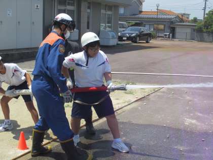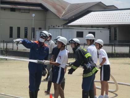 最終日の今日は放水訓練を行いました。生徒達は体育服ですが、署員は、実際に使用している装備を付けて行っています。まさに本番さながらです。この5日間で仕事の大変さを学ぶことができたと思います。
