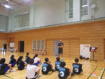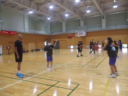 富山グラウジーズの晴山ケビン選手とコーチに来ていただき、バスケットボール部の生徒たちへご指導していただきました。