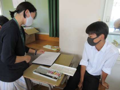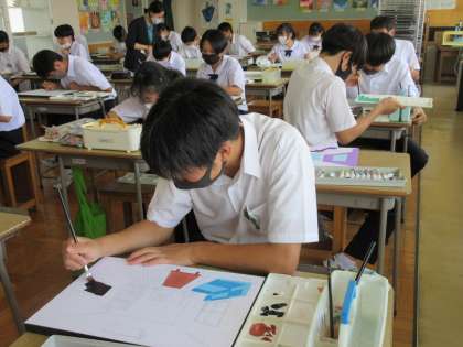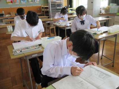 本日の美術の授業の様子です。一点透視図法を用いて、自分の将来の部屋を描いています。色やデザインに一つ一つこだわりながら、集中して作品を仕上げています。続きは夏休みの課題になります。今学期の授業も残りわずかですが、最後まで気を抜かずに取り組んでいますね。