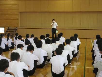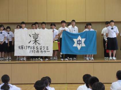 体育大会結団式の様子 その1 公開日 2022/07/14 更新日 2022/07/14 生徒会 本日(7/14)の5時間目に体育大会の結団式を行いました。今年度の体育大会のスローガンは、「凜〜輝け!絆を彩る190のカラー〜」です。全校生徒ひとりひとりのカラーが光り輝き、絆を深め、体育大会を鮮やかに彩ってほしいという思いが込められています。