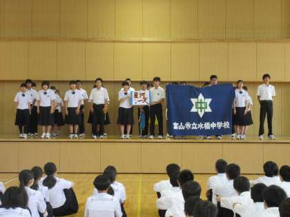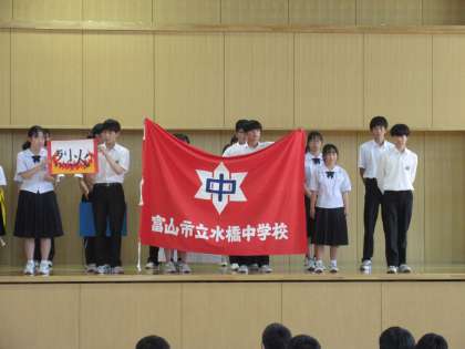 写真は、団ごとに役員とスローガンの紹介を行っている様子です。この後、各学年に分かれて、出場種目と係を決めました。体育大会は9月10日(土)を予定しています。団役員は夏休み中に準備を行います。全校で練習をするのは、2学期からになります。どんな体育大会になるのか、楽しみですね。
