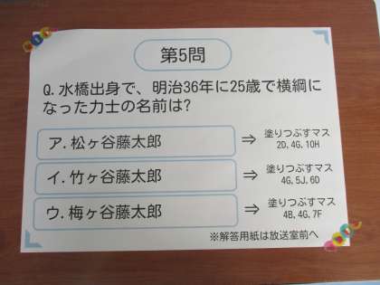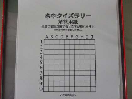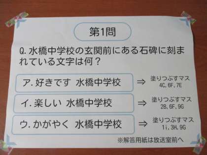 本校広報委員会では、水橋中学校や地域のことをもっと生徒に知ってもらう目的で「水中クイズラリー」を行っています。水橋にちなんだ問題を委員で作成し、校内の15カ所に設問ごとに設置しました。解答用紙をロジックパズル形式にし、全問正解すると文字が現れるしくみになっています。来週21日までの期間にクイズに答えて水橋をもっと好きになろう!
