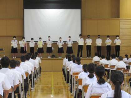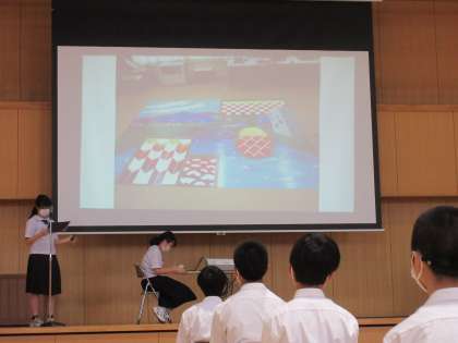 終業式 その1 公開日 2022/07/23 更新日 2022/07/23 最近の水中の様子 <写真 上>受賞報告会のようす 1学期の受賞した生徒を紹介しました。 <写真 下>美術部壁画紹介のようす 「世界一かわいい美術館」に設置した壁画を紹介しました。