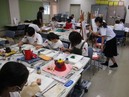 美術部では油絵教室を行っています。キャンバスに描いた下絵に配色しています。