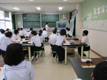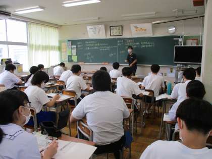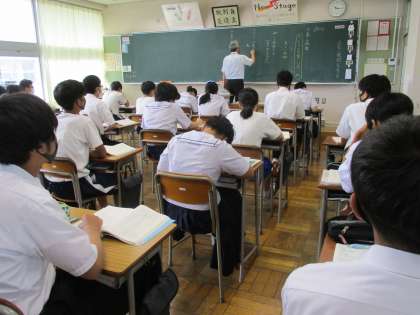 <写真上>1年理科 気体の性質 <写真中>3年国語 故郷(魯迅) <写真下>3年社会 公民 少子高齢化