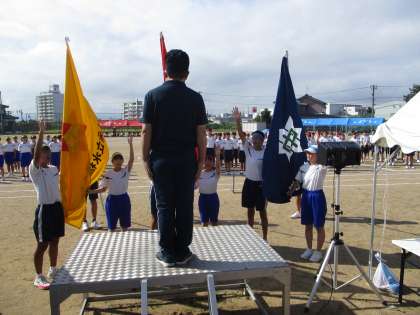 体育大会 開会式 公開日 2022/09/13 更新日 2022/09/13 最近の水中の様子 開会式の様子です。 声高らかに選手宣誓が行われました。水中伝統のエール交換では、実行委員会、黄雲団、赤嶺団、青嵐団の順に力強い声が響き渡りました。