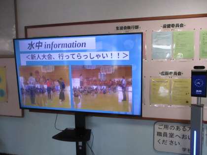 部活動のようす 公開日 2022/09/15 更新日 2022/09/15 最近の水中の様子 <写真上>ソフトテニス部女子 <写真中>玄関前ウェルカムモニター 明日から市新人戦です!新チームの頑張りを期待しています!