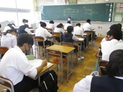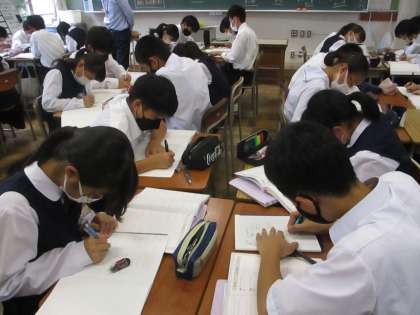 <写真上>生徒玄関にて選挙活動実施中 <写真中>3年理科 単元テスト <写真下>1年数学 方程式
