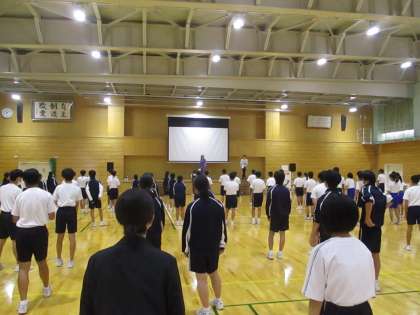 モリ・ケントさんによるダンスプロジェクトがスタートしました。今日は、ゲストに歌手でダンサーのASAHIさんも合流し、本校2年生と三成中2年生合同のダンス・ワークショップを行いました。緊張していた生徒達も、ケントさんの明るく分かりやすい説明で大きく体を動かせるようになってきました。ASAHIさんのパフォーマンスにも生徒達は終始魅了されていました。