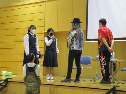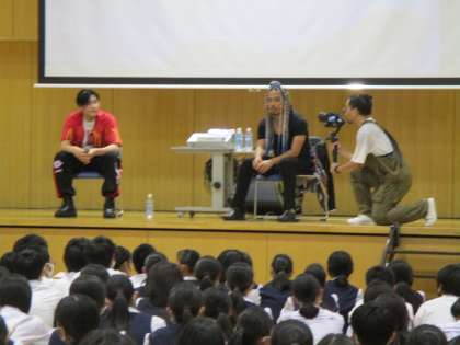 ケントさんとASAHIIさんによるマイケルジャクソンのメドレーやオリジナル曲のNINJYAのダンスパフォーマンスに生徒達は圧倒されました。その後、幸縁会(ケントさんの独自の解釈による言葉)にて生徒の質問に答えてくれました。校訓の「自主・創造・敬愛」をケントさんのダンス人生になぞらえて語ってくれました。
