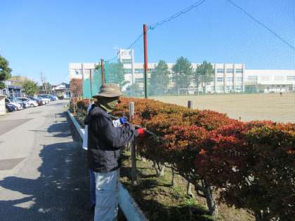 <写真上>1年国語 <写真下>植え込みの雪囲い作業